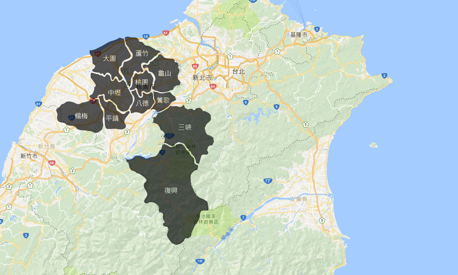 中壢區、平鎮區、楊梅區、復興區